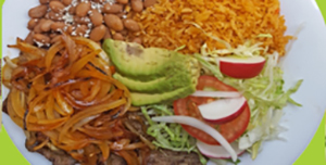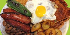 Grilled beef, Arroz, Beans, Chorizo, Sweet Plantains, Friend Egg & Tortilla.