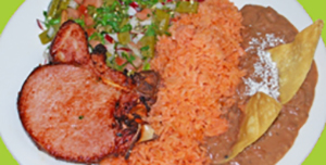Pork Chop with Nopal Salad, Rice and Beans.