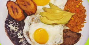 Grilled beef, Rice, Beans, Sweet Plantains & Fried Eggs.